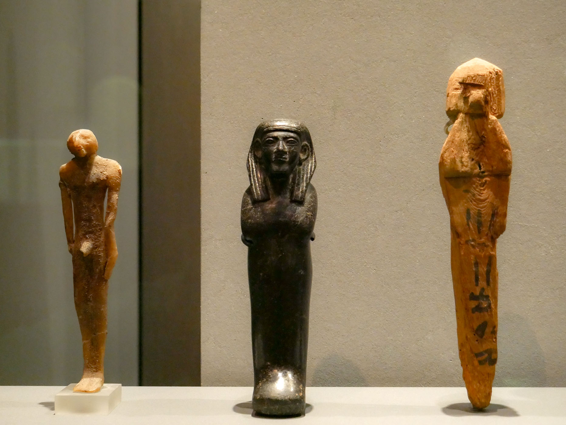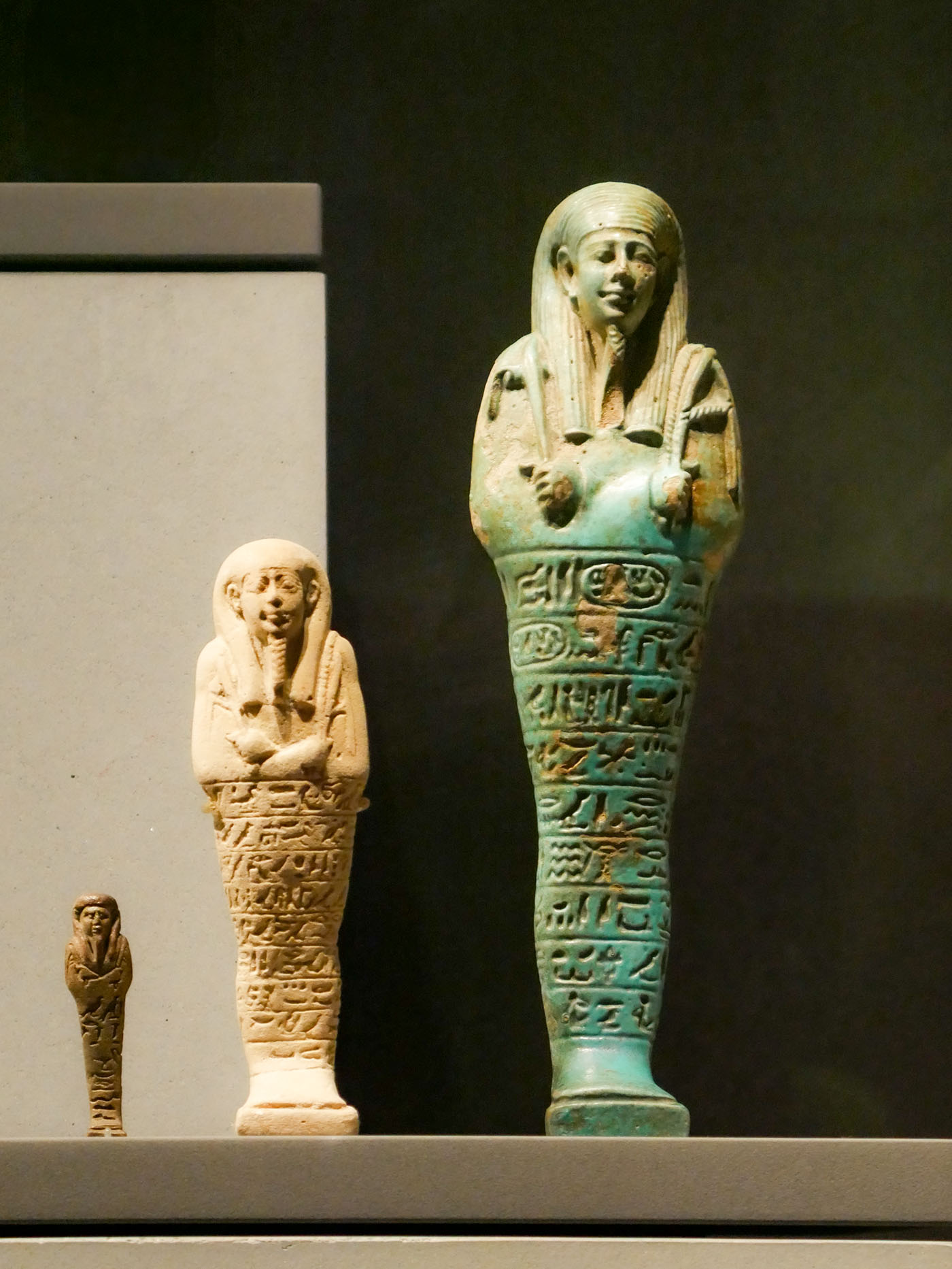 Ushebtis sind kleine, mumiengestaltige Figuren, mit deren Hilfe der Verstorbene seinen Arbeitsverpflichtungen im Jenseits nachkam.