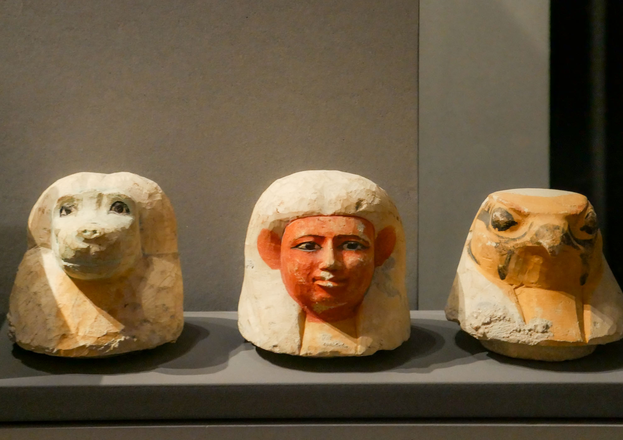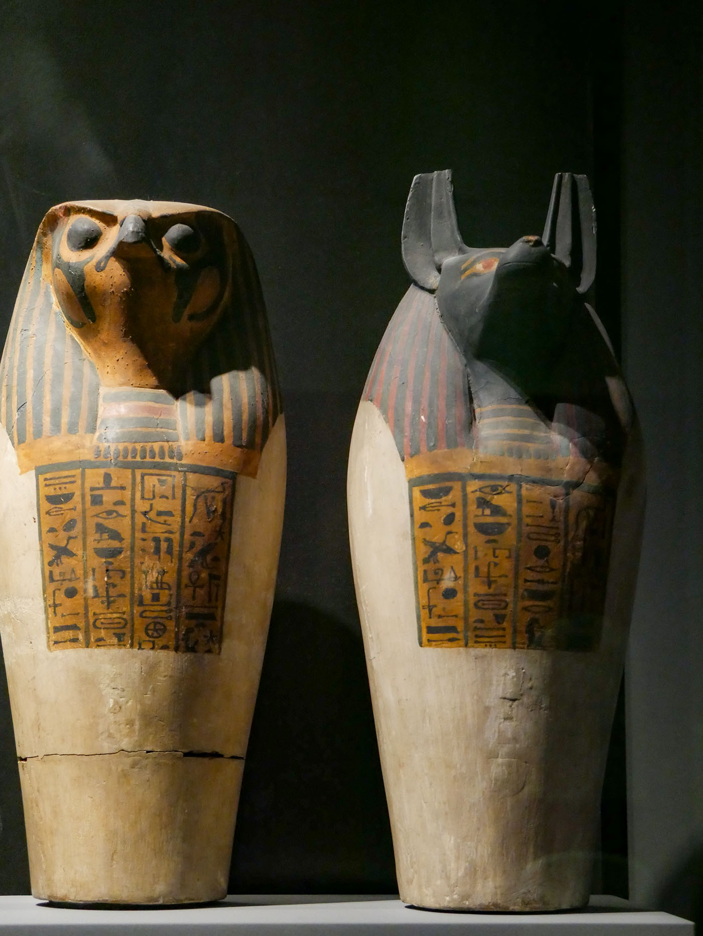 Die bei der Mumifizierung dem Körper entnommenen Organe wurden in vier Gefäßen, den Kanopen, verwahrt. Ihre Deckel können die Gestalt der Köpfe der Horus-Söhne zeigen, der Schutzgottheiten der Eingeweide.