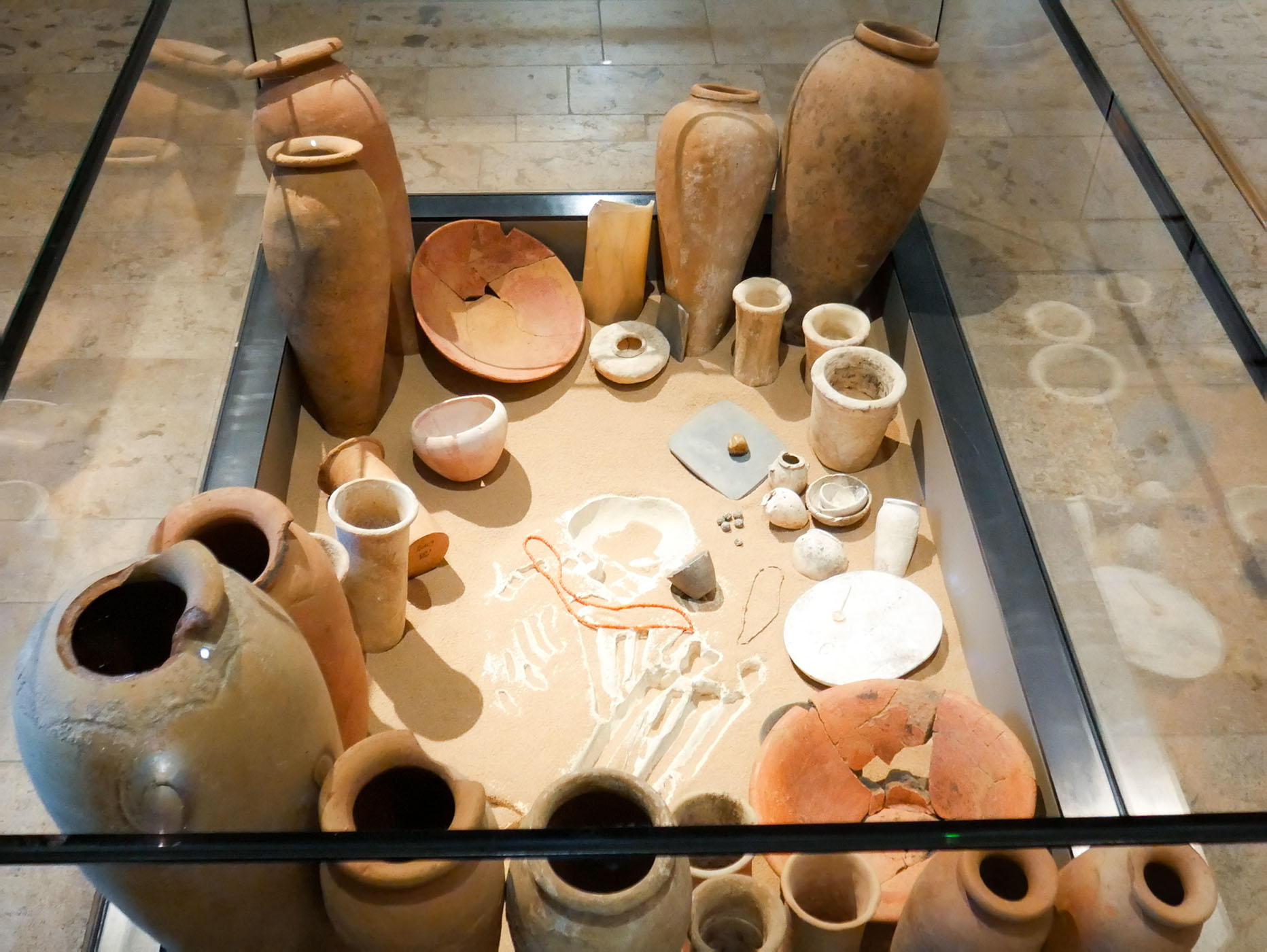 Anzahl und Qualität der Grabbeigaben ermöglichen einen Rückschluss auf die soziale Stellung des Verstorbenen, Tongefäße in verschiedenen Formen gehören zur Grundausstattung, Steingefäße sind Luxusware. Typische Beigaben sind Paletten zur Anreiben der Augenschminke, Ketten auf Karneoleperten und Feuersteingeräte.