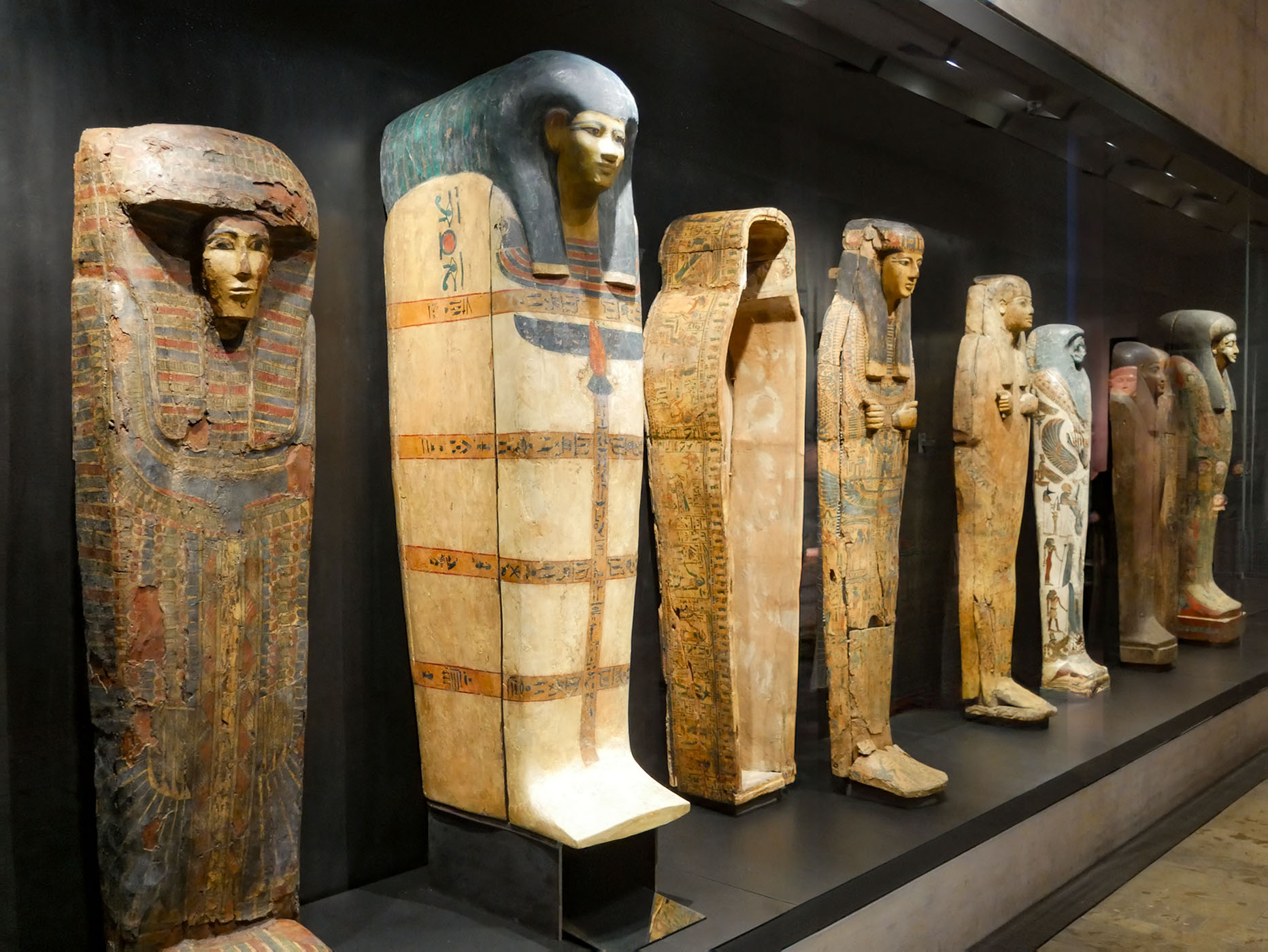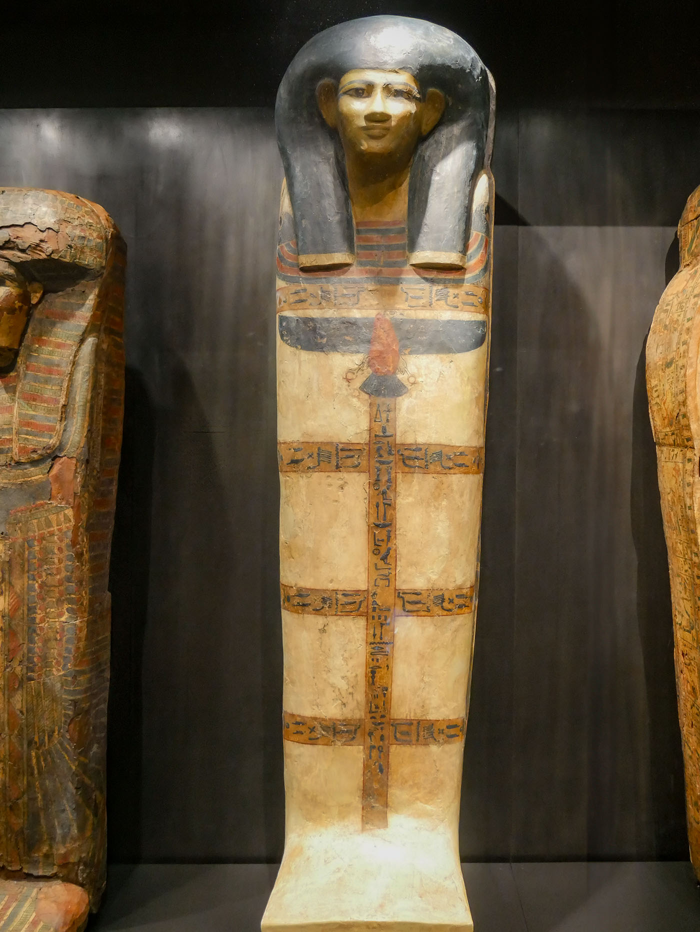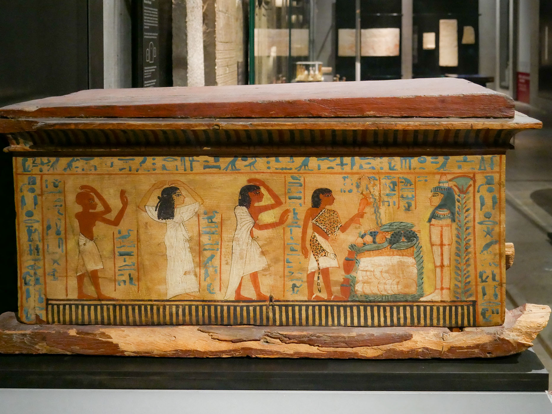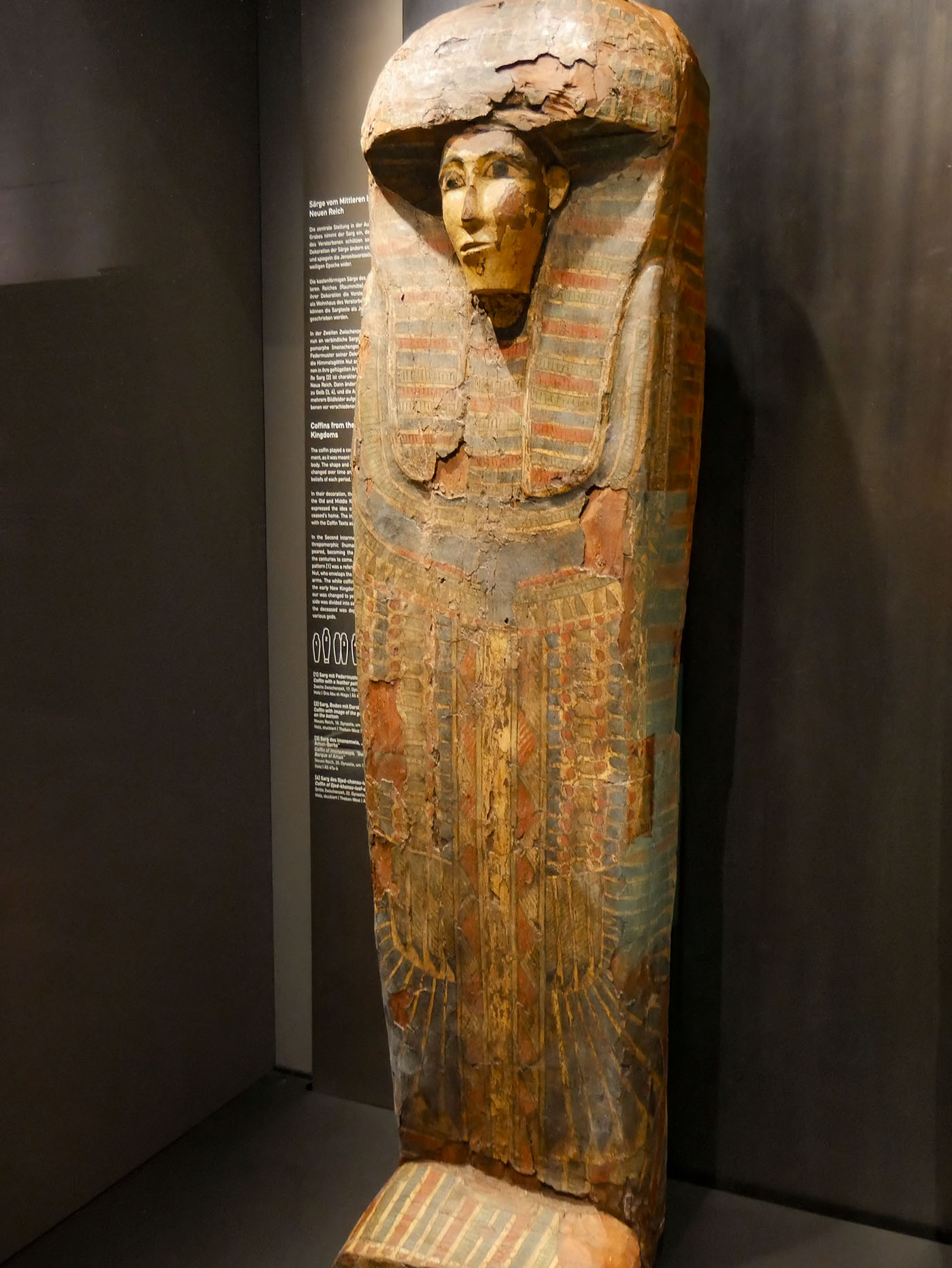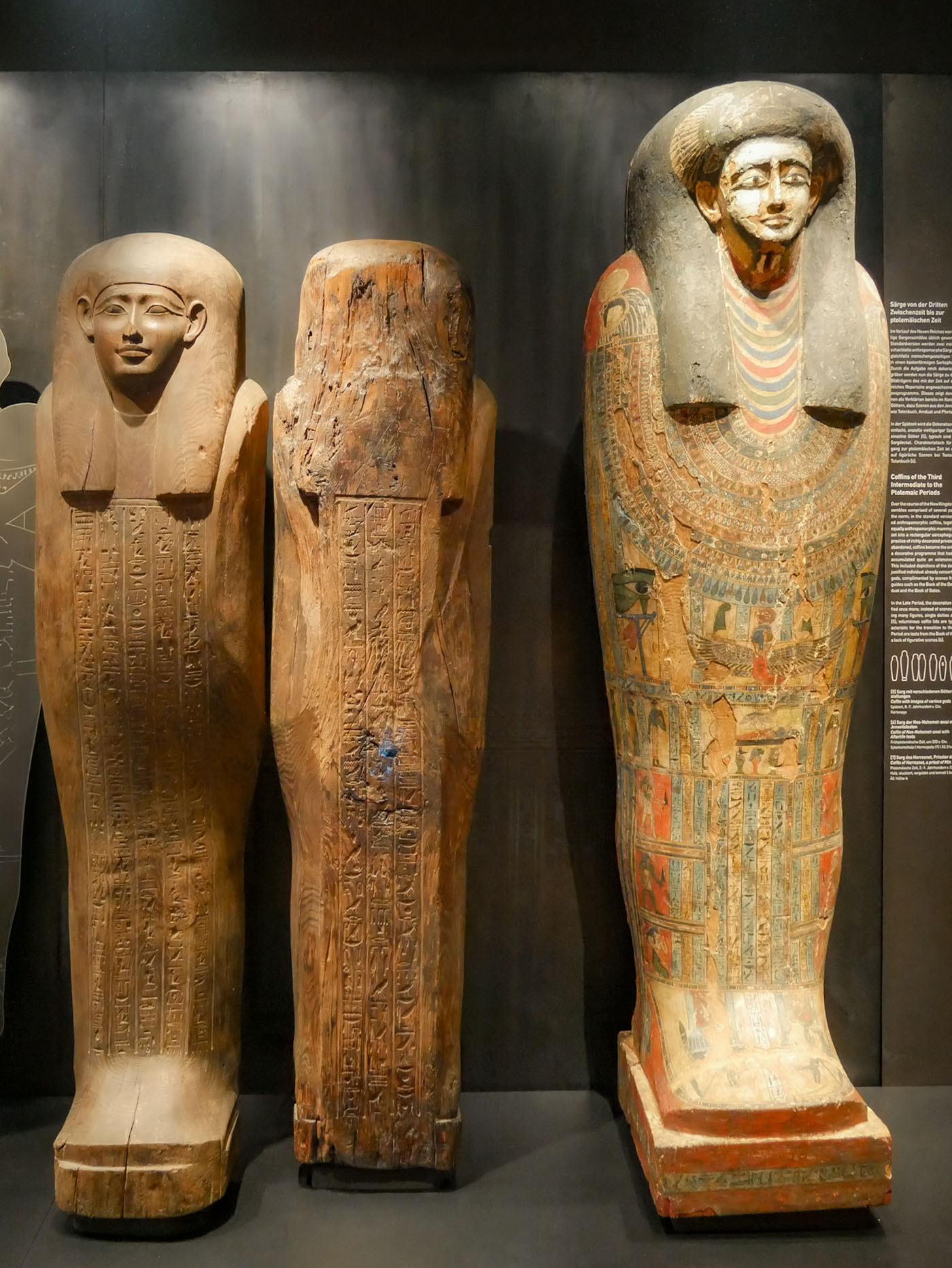 Die kastenförmigen Särge des Alten und Mittleren Reiches (Raummitte) formulieren in ihrer Dekoration die Vorstellung vom „Sarg als Wohnhaus des Verstorbenen“. Im Inneren können die Sargtexte als Jenseitsführer aufgeschrieben werden.
