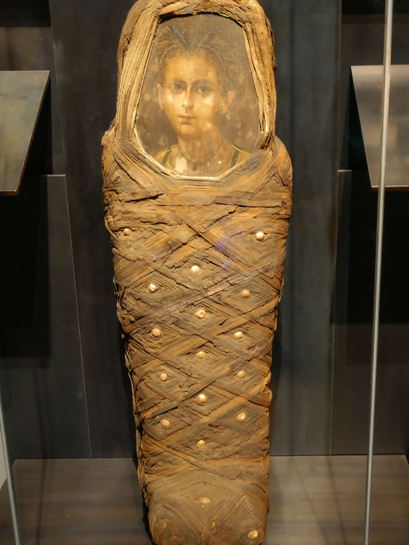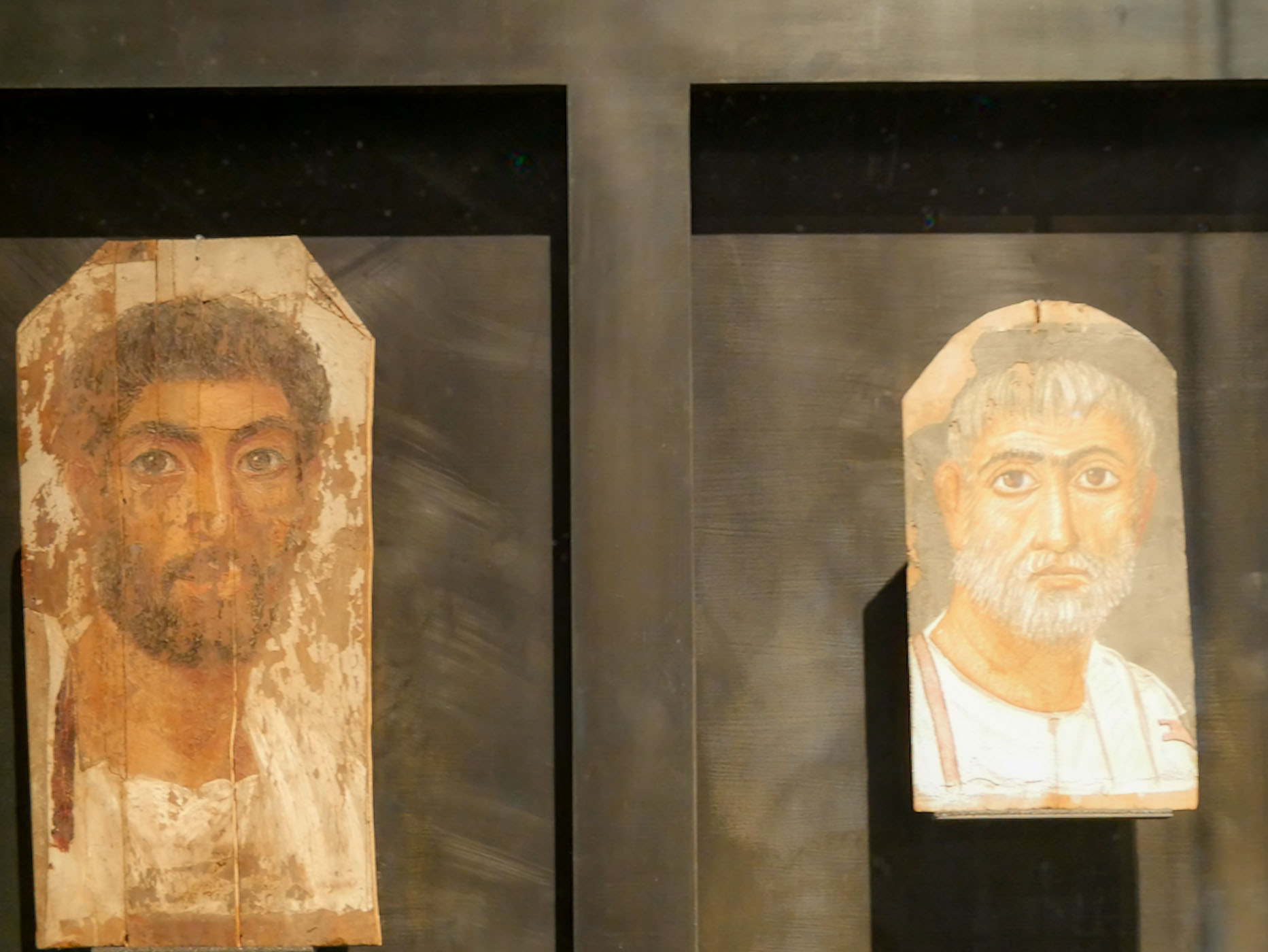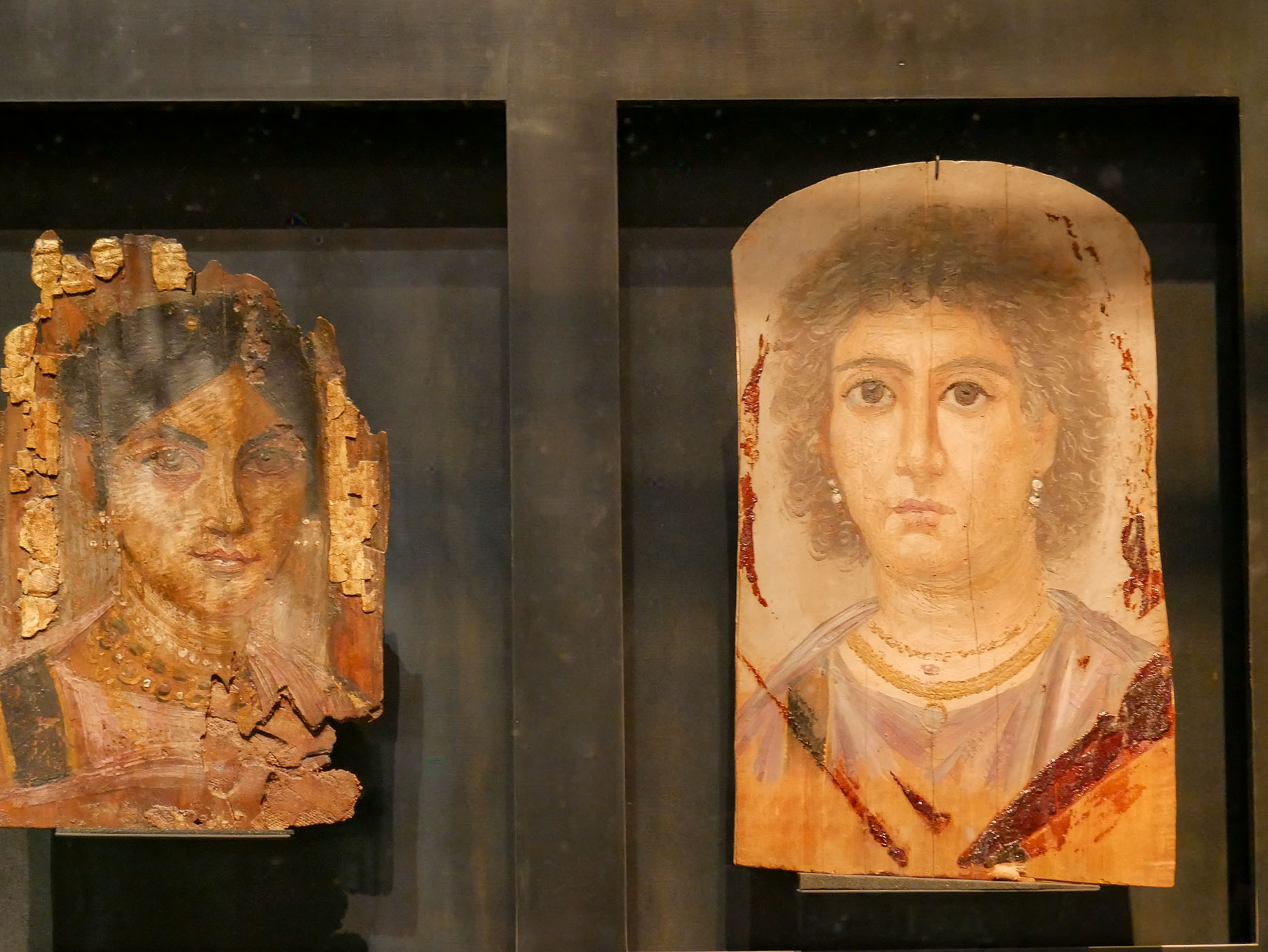 Die in Unter- und Mittelägypten ansässigen Griechen und später auch die Römer übernahmen von Ägyptern viele Sitten im Bereich der Bestattung, darunter die Mumifizierung. Während bei der einheimischen Bevölkerung zum Schutz des Kopfes Masken aus Kartonagen oder Stuck verwendet wurden, statteten die Römer Ihre Mumien mit zweidimensionalen, auf Holz gemalten Porträts aus, die in die äußerste Umhüllung der Mumie mit eingewickelt wurden. Sie tragen oft porträthafte Züge und zeigen die Verstorbenen mit der Haartracht und dem Schmuck ihrer Zeit.