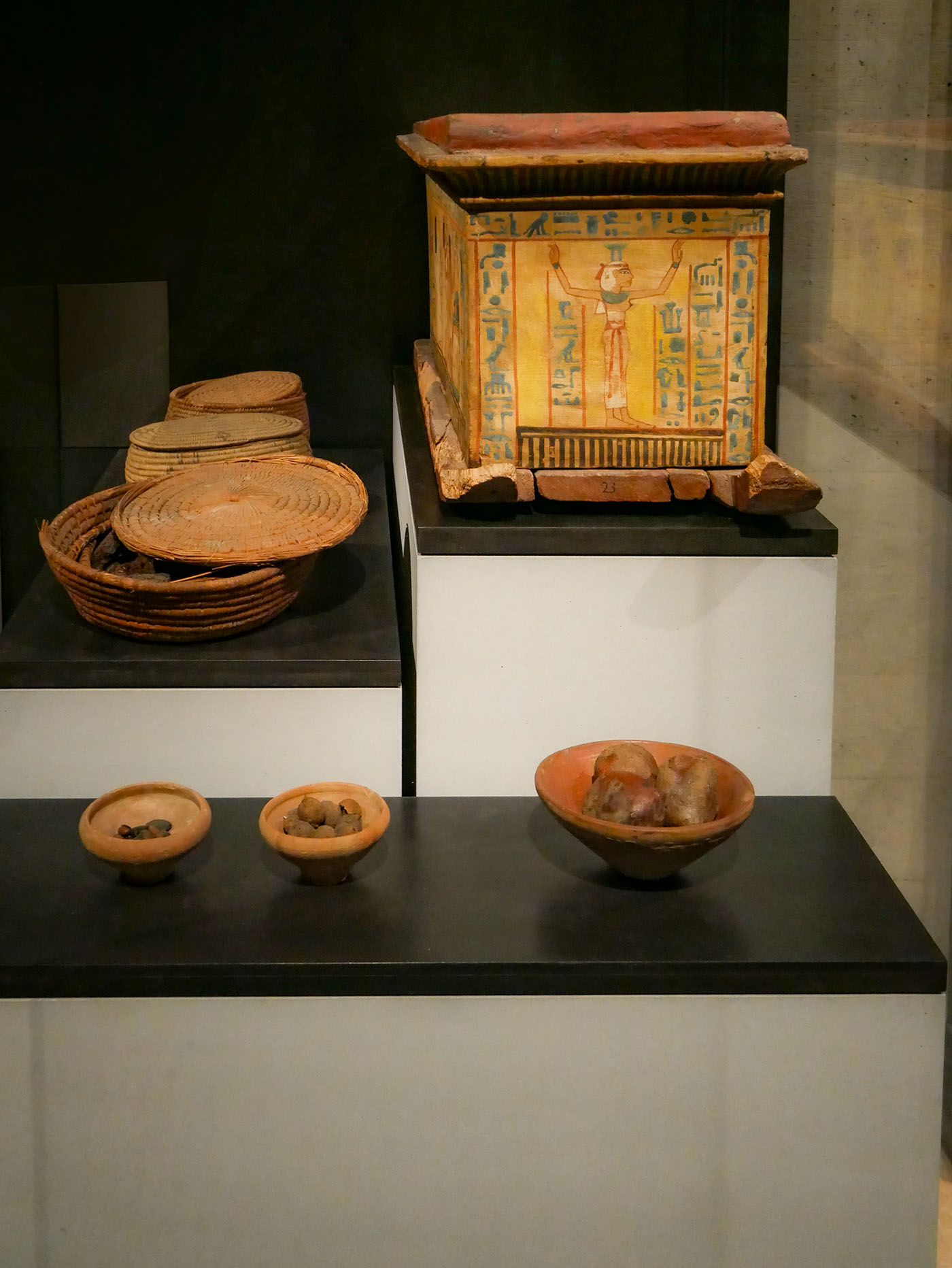 Aus demselben Fundkomplex stammen auch die Naturalien, die als Versorgung für die jenseitige Existenz mit ins Grab gegeben wurden: ein Korb mit Brot, verschiedene Nüsse und Datteln.