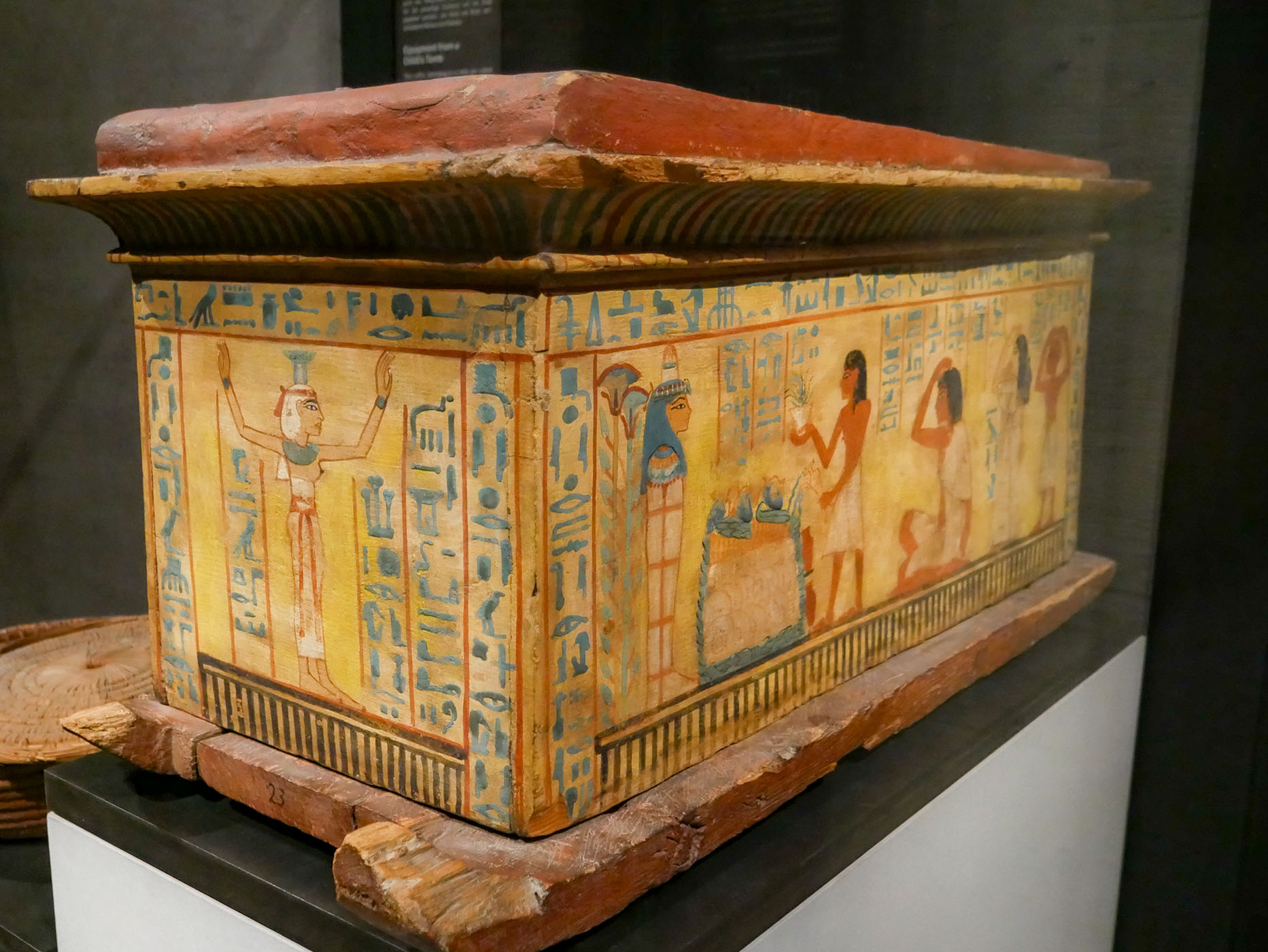Der Sarg eines kleinen Mädchens namens Nefretiri hat die Gestalt eines Götterschreines. Der originale Schlitten verweist auf die gängige Art des Transportes von Lasten auf sandigem Untergrund.