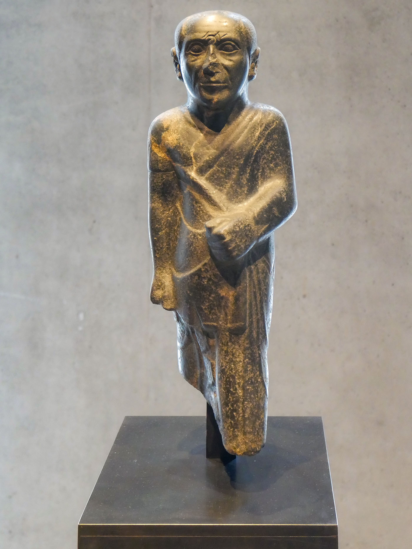 Stand-Schreitfigur eines Priesters mit altersgeprägten Zügen, Römische Zeit, um die Zeitenwende Gabbro ÄS 22